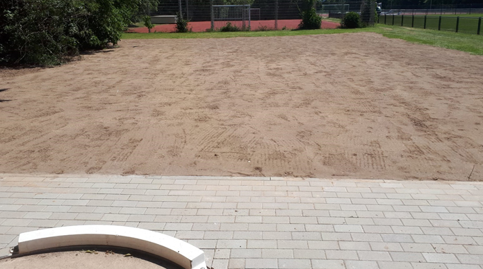 | Nachdem die Weitsprunggrube und der Stabhochsprung-Einstechkasten fertiggestellt wurde, konnte der alte Tennenbelag abgetragen und der Untergrund begradigt werden. | |