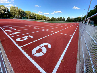 | Der alte Belag wurde versiegelt und durch eine neuen Tartanschicht, baugleich zur restlichen Laufbahn, aufgewertet. Abschließend erfolgten die Linierungen. | |