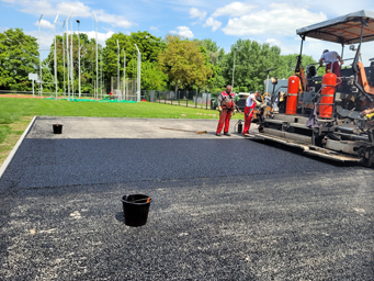Im nächsten Schritt wurde der Platz geteert und somit für den Kunststoffbelag vorbereitet.