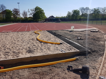 | Die Weitsprunggrube wurde durch einen Sandfang ergänzt. Zur Vorbereitung des Retoppings wurde der alte Belag grundlegend gesäubert. | |